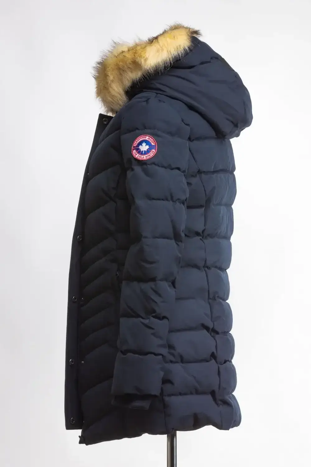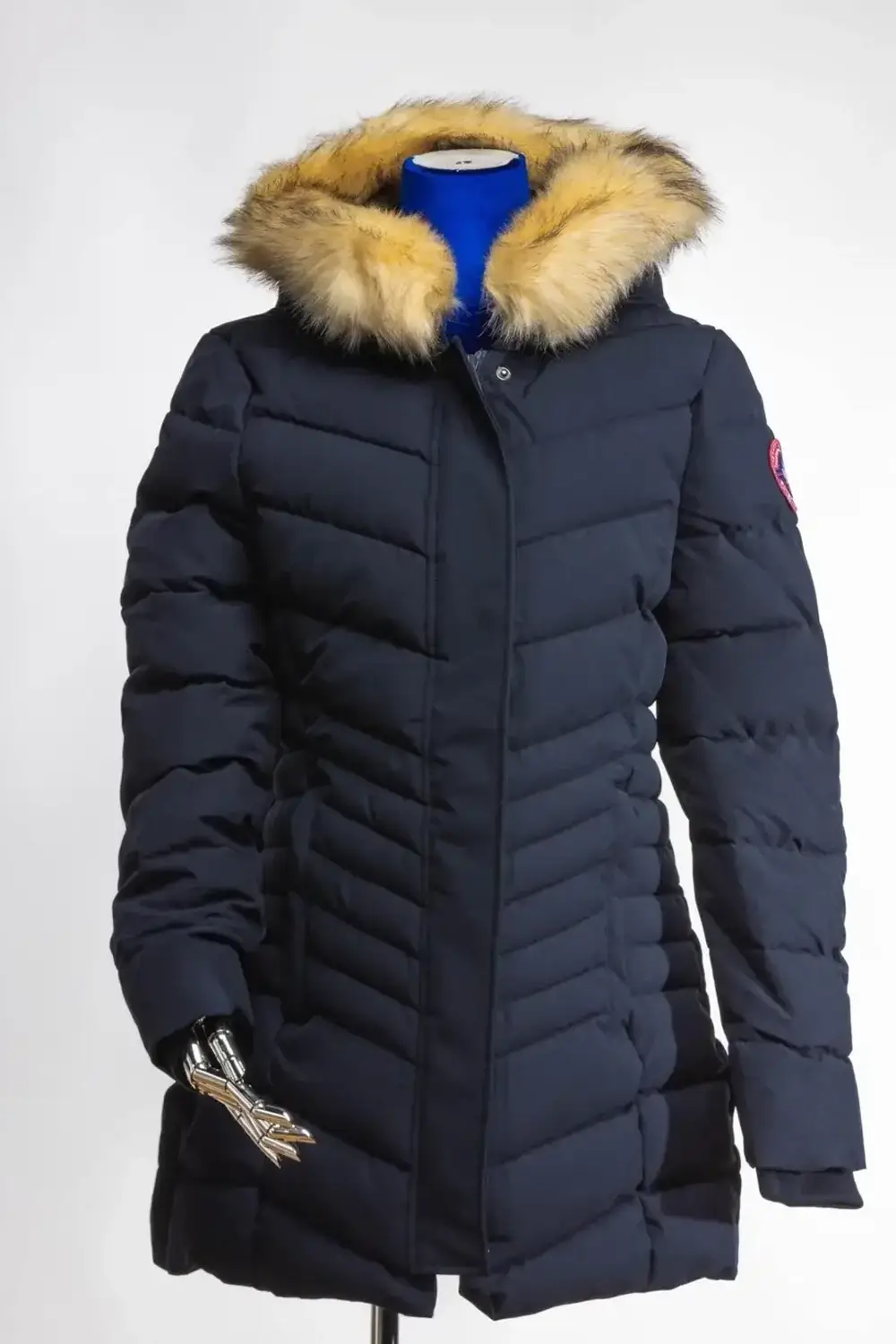 - Élégante couleur bleu marine avec une capuche doublée de fausse fourrure douce pour plus de chaleur et de style